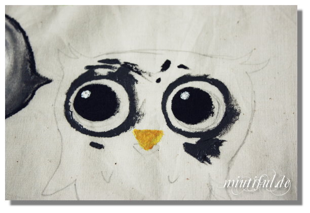 Als nächstes habe ich mit der schwarzen Farbe die Pupille der Eule ausgemalt. Es war ein wenig schwierig, denn beide Pupillen, sowie das kleine weiße Leuchten in den Augen, mussten gleich groß sein.