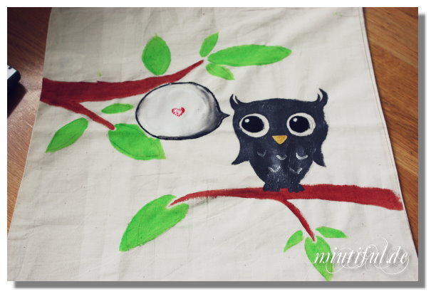 Eigentlich hatte ich vor die Eule ebenfalls schwarz anzumalen… aber durch ein kleines Missgeschick (ich habe versehentlich den Deckel der schwarzen Farbe auf das Gefäß der weißen Farbe geschraubt *stupid!*) habe ich ein dunkles Grau zusammengemischt.