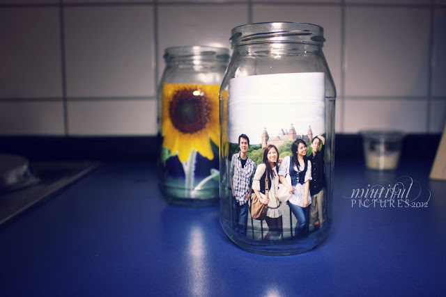 Einfach ein Foto einrollen und in das Glas einschieben. Ich glaube bei den Motiven sollte man besonders drauf achten, dass das Hauptmotiv in der Mitte zu sehen ist, denn durch Wölbung ist nur die Mitte des Bildes zu sehen.