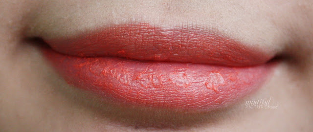 Leider ist mir der Lippenstift einen Ticken zu trocken, obwohl ich vorher mit Lippenpeeling, -pflege und -base meine Lippen vorbereitet habe, setzte sich die Farbe in den Fältchen ab.