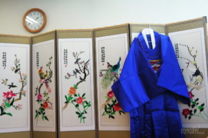 Es war richtig warm in dem Hanbok: Wir hatten einen weißen Unterrock, ein rotes oder pinkes Kleid und dann ein buntes Oberteil. Uns wurde gesagt, dass man damals als unverheiratete Frau ein grünes Oberteil anhatte und als verheiratete dann ein gelbes tragen sollte. Die bunten Oberteile sind sozusagen modernere Variationen des Hanboks.