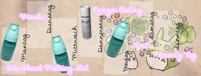 Montags, Mittwochs und Donnerstags kommt das Blackhead Melting Gel von Laneige zum Einsatz, am Dienstag nehme ich mir Zeit für eine Maske und am Donnerstag werden die abgestorbenen Hautpartikell mit dem Enzym Peeling von La Mer entfernt.