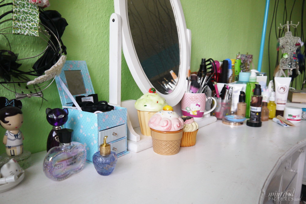 Ich liebe meinen neue Schminkecke ♥ , es gibt halt nur noch einige Kleinigkeiten, die ich verändern möchte: Wie die Haarschmuckpuppe, die auf der linken Seite neben dem Spiegel hängt (habe das Gefühl es wirkt ein wenig überfüllt), die Schubladen für mein Regal (kaufe ich mir wahrscheinlich nächstes Wochenende, wenn ich in Essen bin) und auch die Kuscheltiere finden wohl bald die Tage ihren Weg in den Keller (obwohl ich mich so ungern von ihnen trenne, da sie mich an sehr viele verschiedene wichtige Momente erinnern *www*♥).