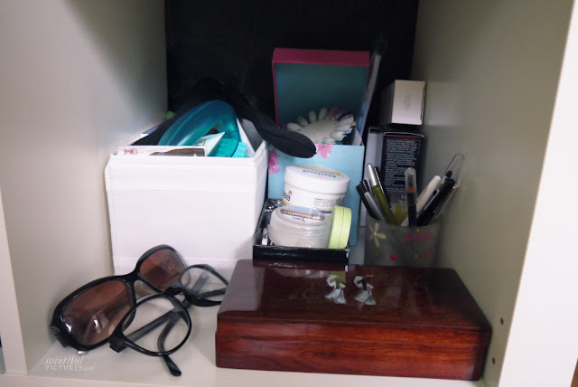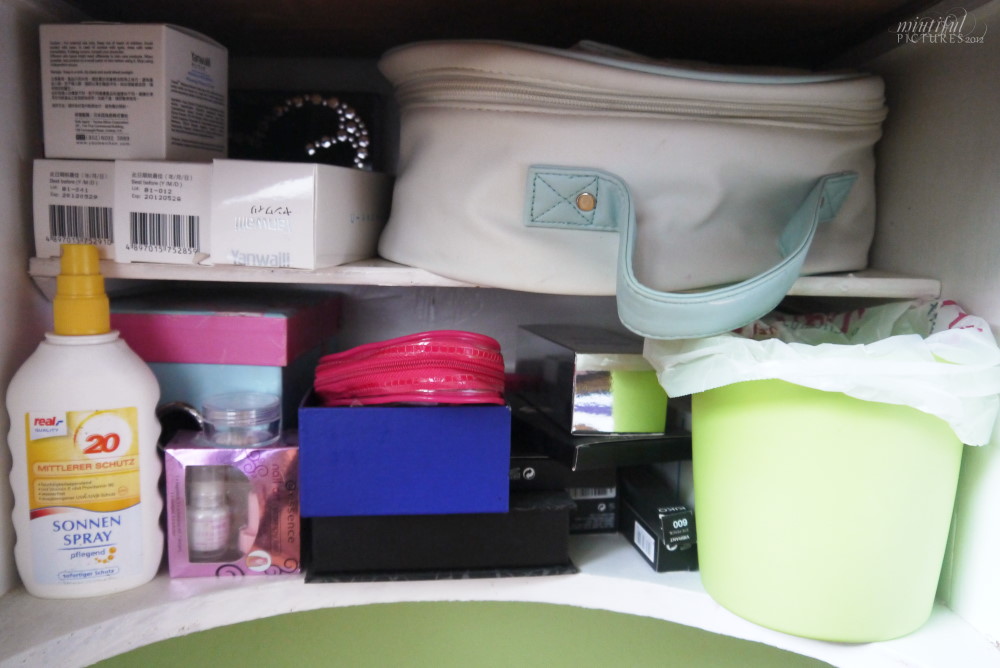 In dem unteren Fach habe ich erstmal meine Sachen verstaut, die ich nicht so oft verwende und die, die ich noch nicht benutzt habe, sondern zur Zeit hamstere und später erst Verwendung finden.