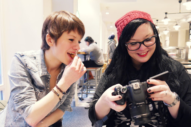 Sissy hatte genialerweise auch noch den Fernauslöser zu ihrer Kamera dabei (… ich mag auch so gern eine Kamera mit schwenkbarem Display haben *www*//) und wir zogen in fröhlicher Blogger-Manier Grimassen und Schnuten – dabei saßen wir im Erdgeschoss direkt neben dem Eingang *höhö*