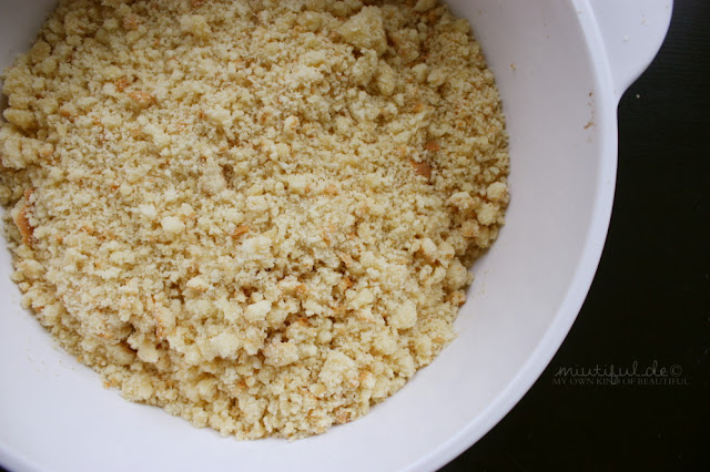 miteinander vermengt und dann bei 180°C (Ober- und Unterhitze) ca. 60 Minuten gebacken – zwischendurch mit einem Zahnstocher reingepiekst und geschaut, ob der Kuchen schon durch ist. Den Kuchen abkühlen lassen und dann in einer großen Schüssel (oder Auflaufform) zerbröseln. Es wird meistens dazu geraten die harten Ränder von dem Kuchen abzuschneiden, aber da mein Kuchen sehr flach geworden ist, hätte ich nach dem Abschneiden nicht mehr viel von dem Kuchen gehabt, und habe also die Ränder alle dran gelassen.