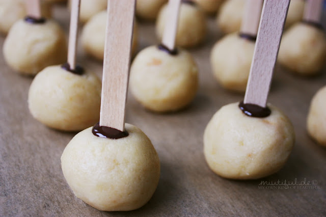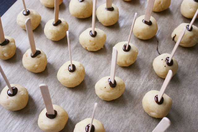 Aus dem Kuchen-Frosting-Matsch runde Kugel formen, die Größe kann je nach Stiellänge und -größe variiert werden: Ich habe aus meiner Menge 26 Golfball-große-Kugel herstellen können.