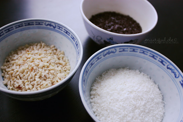 Zum Dekorieren habe ich Schokostreusel, gehackte Mandeln und Kokosraspeln gehabt. Und zu der weißen Kuvertüre habe ich einmal blaue und einmal grüne Lebensmittelfarbe hinzugefügt.