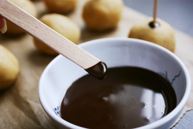 Die Stiele zuerst in die Schokolade tunken und dann in die Cake Pops.