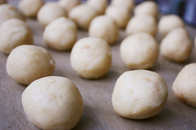 Um unseren zerbröselten Teig später auch wirklich in kleinen Kügelchen formen zu können, müssen wir diesen “matschiger” machen. In vielen Rezepten habe ich Varianten mit Konfitüre, Marmelade oder nur mit Frischkäse entdeckt.