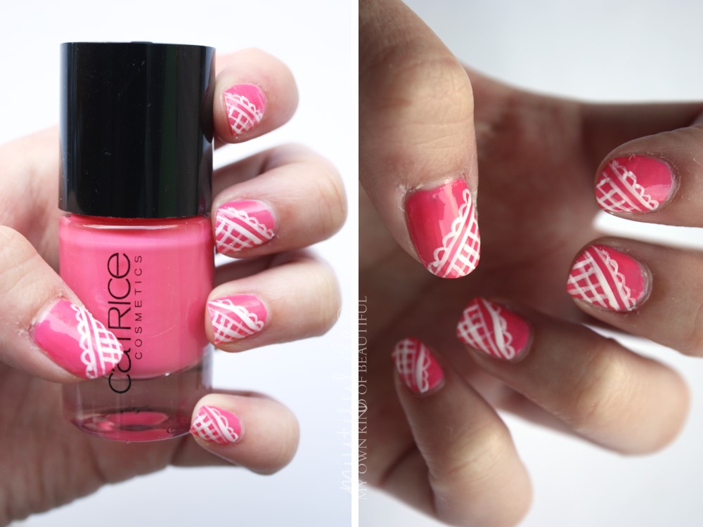 Ich habe lange überlegt, wie ich diesen Namen und die Farbe in ein Nail Art umsetzen könnte, aber mir ist wirklich nichts eingefallen (außer vielleicht das Wort THINK mit der pinken Farbe auf die Nägel zu schreiben… *höhö*) und daher habe ich mir gedacht, dass ein girly-girl-Design ganz gut zu dem Namen und der Farbe passt.