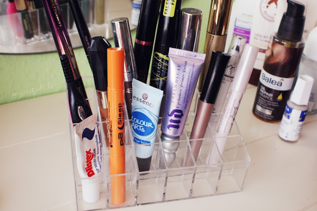 Alternativ kann man die Lippenstiftaufbewahrung auch für die “alltäglichen Beautyprodukte” benutzen, wie Lippenpflege, Primer, Augenbrauenformer, Eyeliner und Mascara. Es klappt ganz gut, aber für Lippenstifte ist das Teil dann doch besser geeignet.