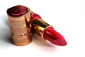 Was ich aber nach einigem Testen nun definitiv als Minuspunkt an den Lippenstiften wahrnehmen musste, war leider die stark abgeschrägte Form der Lippenstifte, die den Auftrag erschweren. Als ich dann den pinken Lippenstift dann auch öfter benutzt habe, habe ich gemerkt, dass ich durch die schräge Form den Lippenstift nach hinten gedrückt habe, wodurch der Lippenstift sich beim Hoch- und Runterdrehen an der Hülse entlangschrammte…