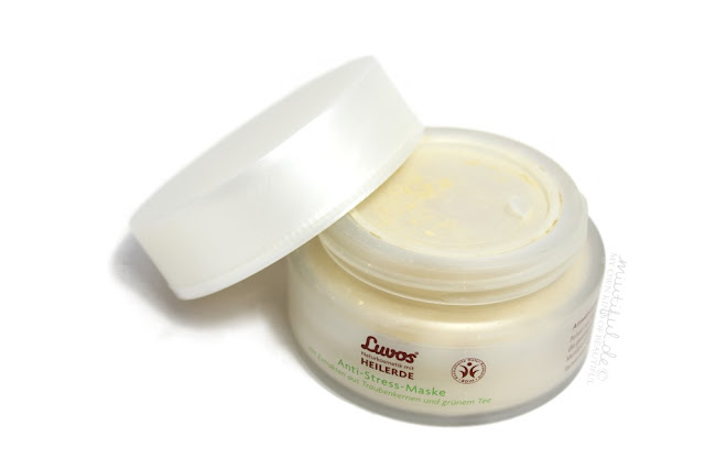 Was mir auf den ersten Blick an der unfertigen Maske im großen Glastiegel von Luvos gefällt sind die Inhaltstoffe der Anti-Stress-Maske: Denn neben Heilerde wirken natürliche Antioxidantien aus Traubenkernen und grünem Tee hautberuhigend und schützend (… und ich bin bekanntlich ein sehr großer Fan von grünem Tee :D). Hinzu kommt, dass die Maske ohne synthetische Farb- und Duftstoffe hergestellt wurde und durch die trockene Form ist es möglich die Heilerde-Maske frei von Konservierungsstoffen zu halten. Auf der Verpackung findet man sogar das BDIH-Symbol – ein Siegel für kontrollierte Natur-Kosmetik.