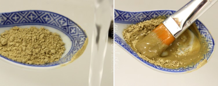 Mit dem Suppenlöffel ist es recht einfach die Heilerdemaske aus dem Tiegel zu holen und sie bietet eine gute Oberfläche, um die gewünschte Menge Wasser hinzuzufügen (wie immer: lieber nach und nach etwas Wasser…) und mit dem Pinsel zu vermischen.