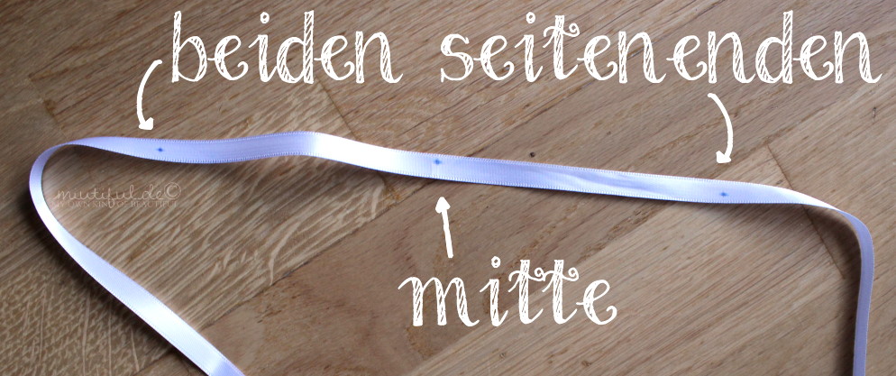 Das Band auf ungefähr 1m zuschneiden und markiert mit einem Filzstift die Mitte. Nun nehmt ihr das Geschenkband und haltet sie an euren Kopf in etwa so, wie ihr das Blumenhaarband später tragen würdet und kennzeichnet die Punkte, wo die Blumen enden sollen. Ich habe die Markierungen ungefähr 1-2cm oberhalb meiner Ohren gesetzt.