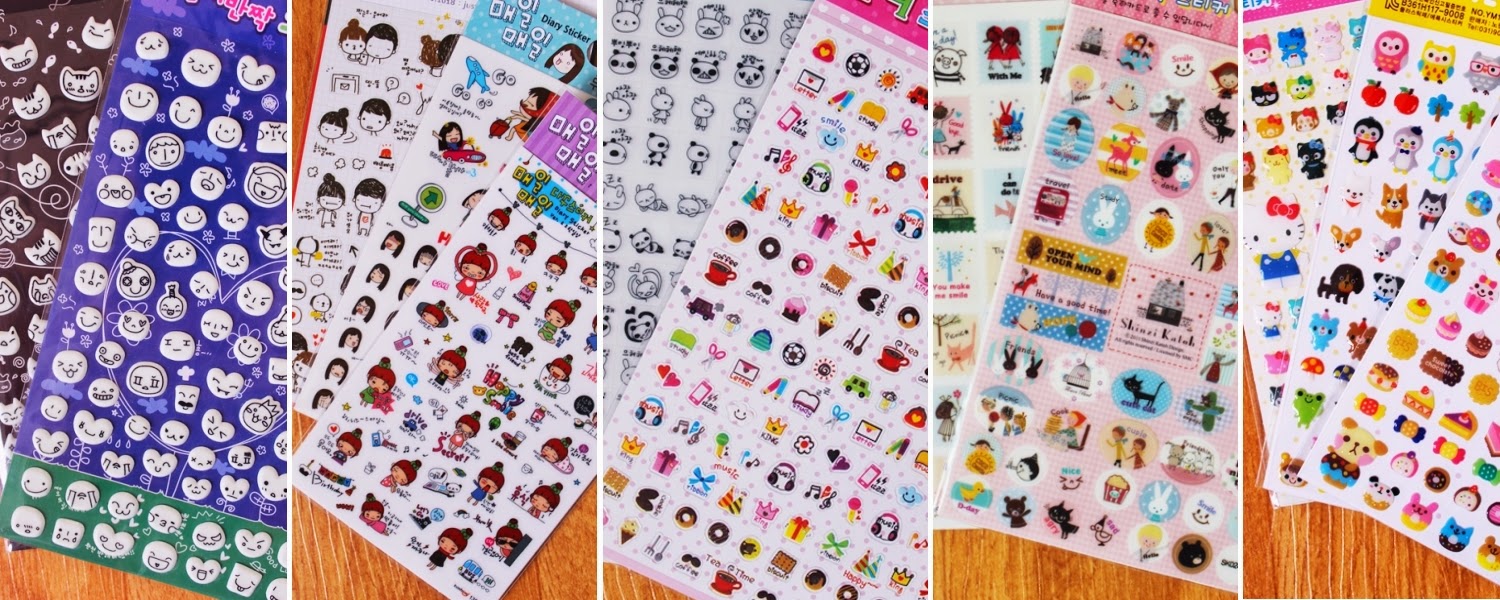 Die günstigsten Sticker kosten 1000Won {knapp 70Cent} und manchmal befinden sich zwei Bögen in solch einer Packung. Dann gibt es noch welche für 4.500-6.500Won {2,50-3,50€}, wo sich dann 4-6 verschiedene Stickerbögen befinden. Es gibt Sticker, die im Dunkeln leuchten, mit süßen Zeichnungen, die den Alltag witzig wiederspiegeln, im Vintage-Stil oder superkitschig im Hello Kitty-Stil!