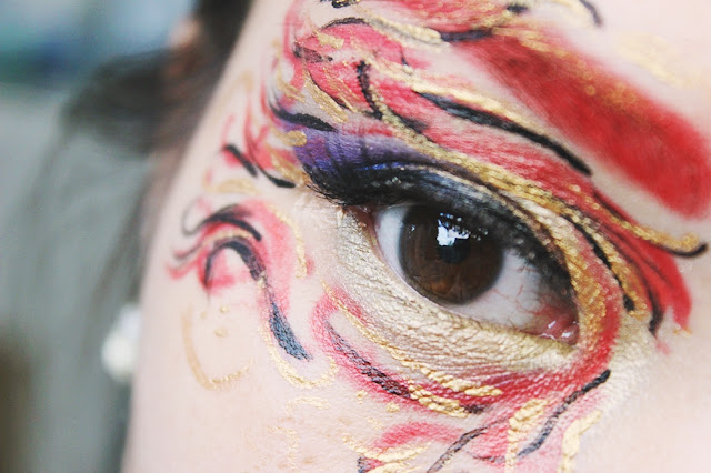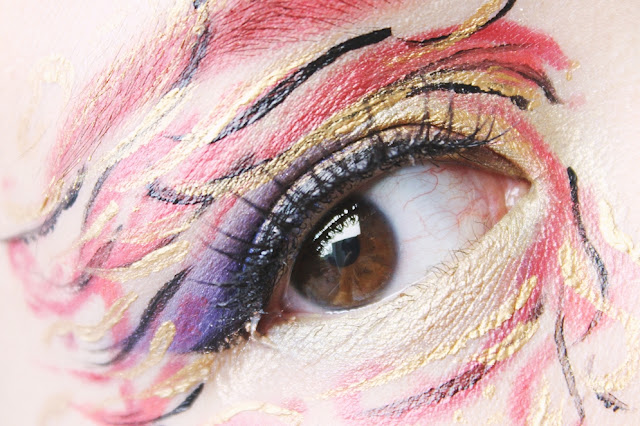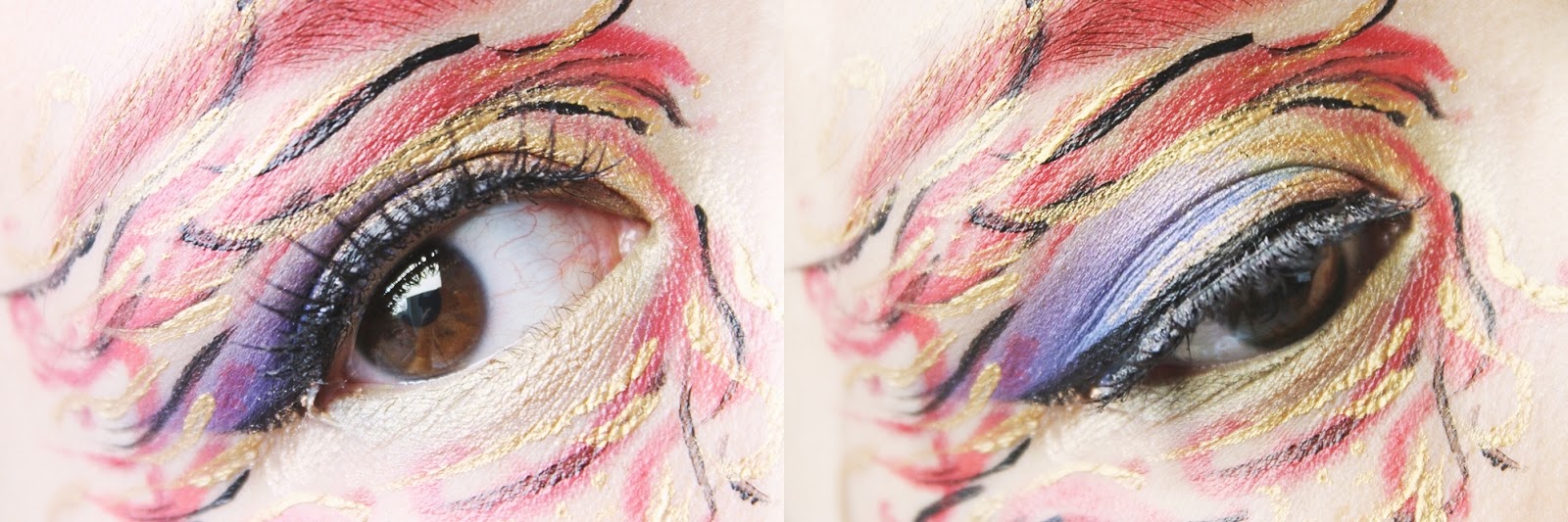 Bei diesem Augen-Make Up habe ich mich zum ersten Mal getraut komplett über das Lid hinaus zu schminken und habe mich von Miss Xtravaganz‘ kreativen und ausgefallenen Looks inspirieren lassen. Der Look und die Farben sind stark angelehnt an >>dieses Bild von Sailor Mars, das ich beim Googlen gefunden habe.