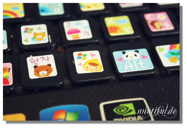 2) Es sind Englisch-Koreanische Sticker gewesen, d.h. auch dass zum Beispiel Y und Z vertauscht sind oder dass einige Sonderzeichen woanders liegen! Aber da ich meine Tastatur schon so gut wie auswendig kann… ist es auch okay!