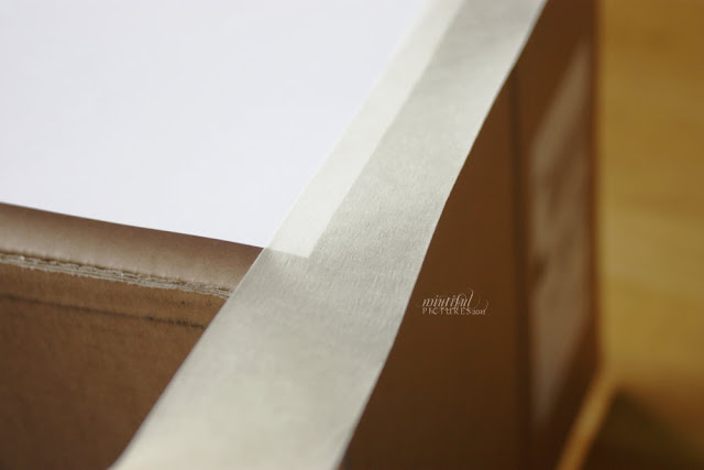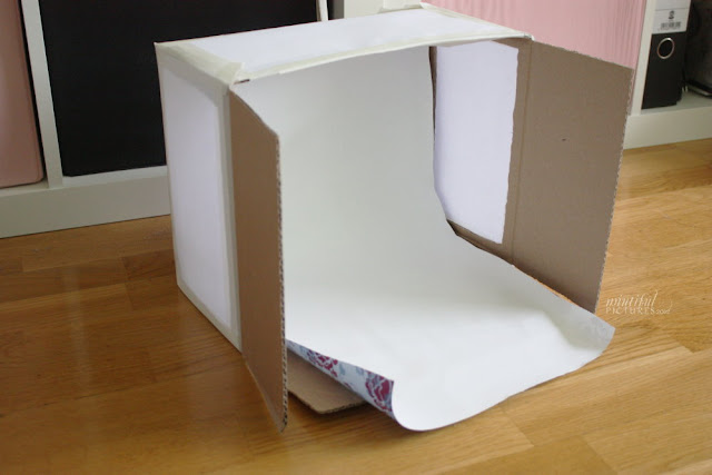 So mit allen drei Seiten verfahren und eigentlich ist die Lightbox schon fertig. Für den Hintergrund braucht man etwas “Unendliches”, damit man keinen Knick oder ähnliches sieht. Ich habe zum Ausprobieren einfach die Rückseite von Geschenkpapier genommen (weil ich kein großes Blatt DinA3 hatte), zurechtgeschnitten und mit Kreppband angebracht. Das Tolle an Kreppband ist, dass man es sehr leicht wieder entfernen kann, d.h. man kann die Box immer wieder mit verschiedenen Hintergründen verwenden.