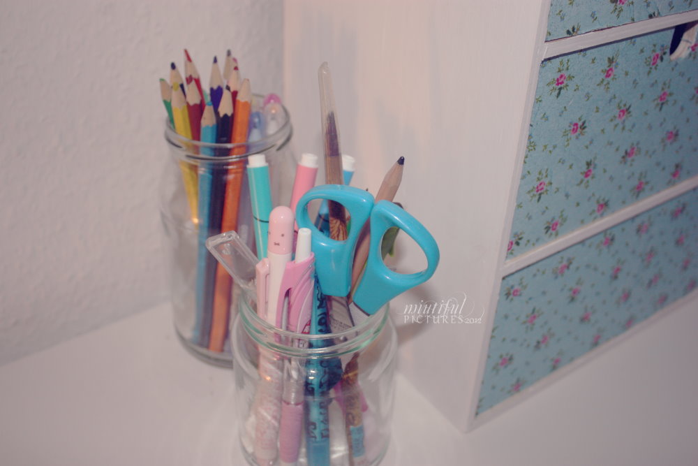 Und meinen Winnie Puuh-Stiftehalter habe ich durch zwei Einmachgläser ausgetauscht in zwei Größen, so dass ich einen besseren Überblick behalten kann :3 Sieht jemand ein Smiley? 😀
