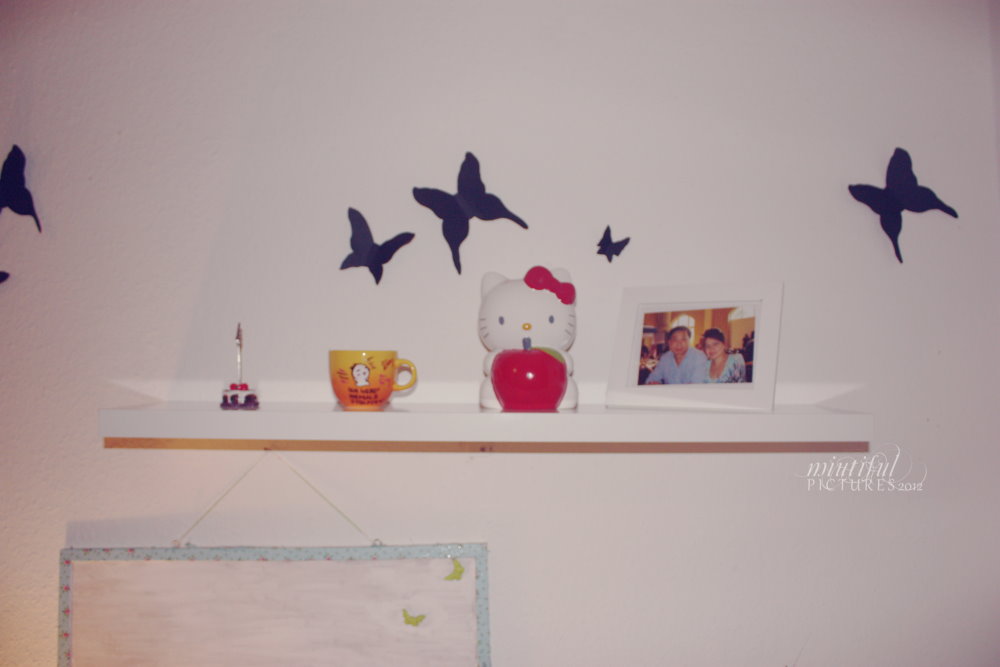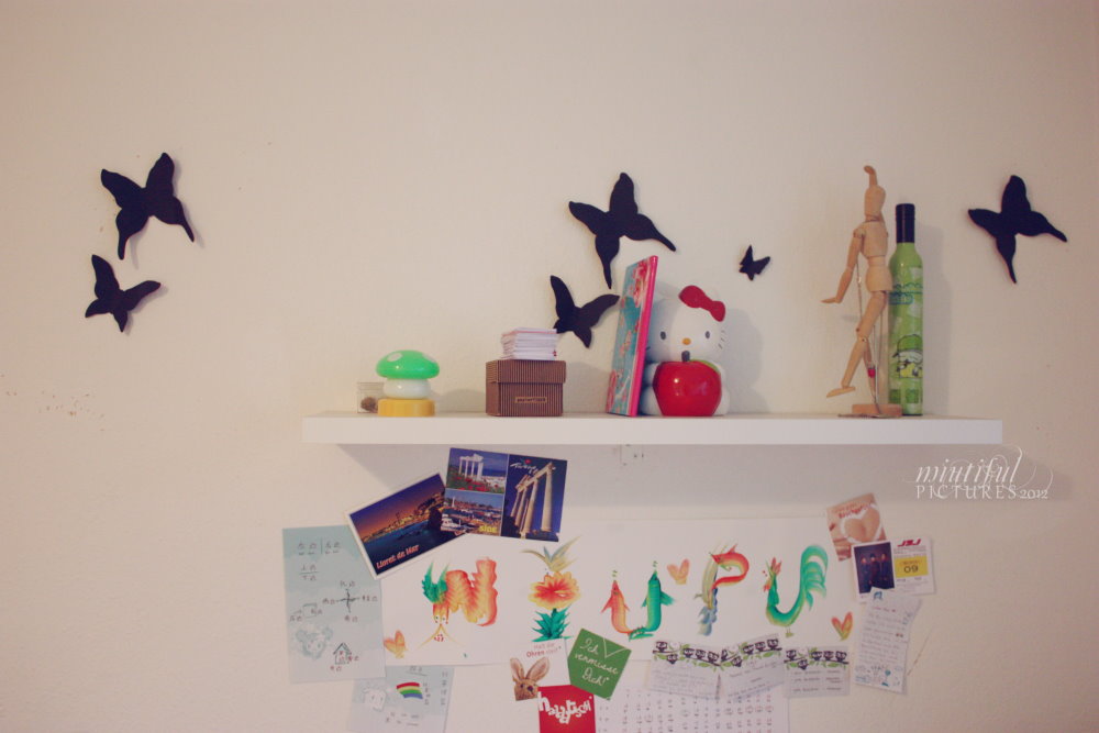 Die Schmetterlinge habe von meinem anderen Projekten wieder aufgegriffen, damit sich die “Thematik” in meinem Zimmer sozusagen wiederholt und weil ich Löcher in der Wand habe – das Ergebnis eines Wandschranks, welches nachts einfach auf den Tisch plumste.