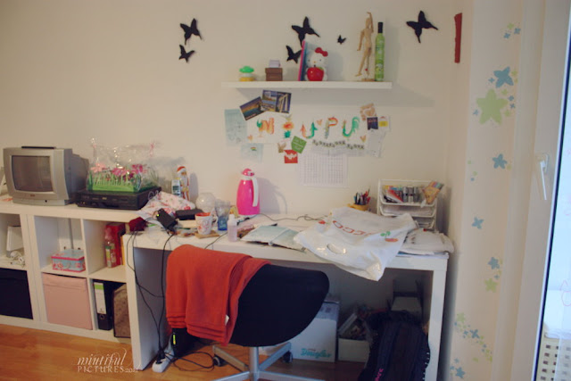 Rechts hatte ich so ein Papierordnungssystem von Ikea gehabt, wobei ich dann oben einfach total viel Krimskrams draufgeschmissen habe. Rechts in der Ecke unter den Tüten waren dann immer meine Unisachen… und sonst: Handy, Kalender, Notizbuch, Teekanne, Winnie Puuh-Stiftehalter, wo nicht alle Stifte reinpassten, einen pinken Blingbling-Taschenrechner den ich überhaupt nicht brauchte und viele andere Sachen…