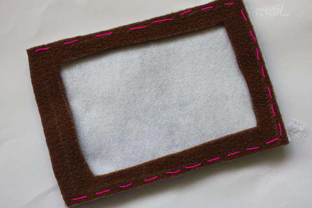 Für die obere Seite, die wir ausgelassen haben das br.Fleece und wß. Filz miteinander vernähen und dann das bearbeitete Stück Fleece nur alleine “durchnähen”, sodass der Stoff nicht ausfransen kann. Auch der Rahmen/die Öffnung, die für den Bildschirm gedacht ist, “durchnähen”: