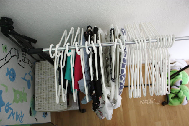 Die Kleiderstange habe ich bei meinen Eltern im Keller gefunden (was wir nicht immer alles haben) und es ist wirklich sehr praktisch: Ich kann getragene, aber nicht dreckige Kleider aufhängen und auch die Bügel von Cardigans und co., die ich aus dem Kleiderschrank genommen habe draufhängen.