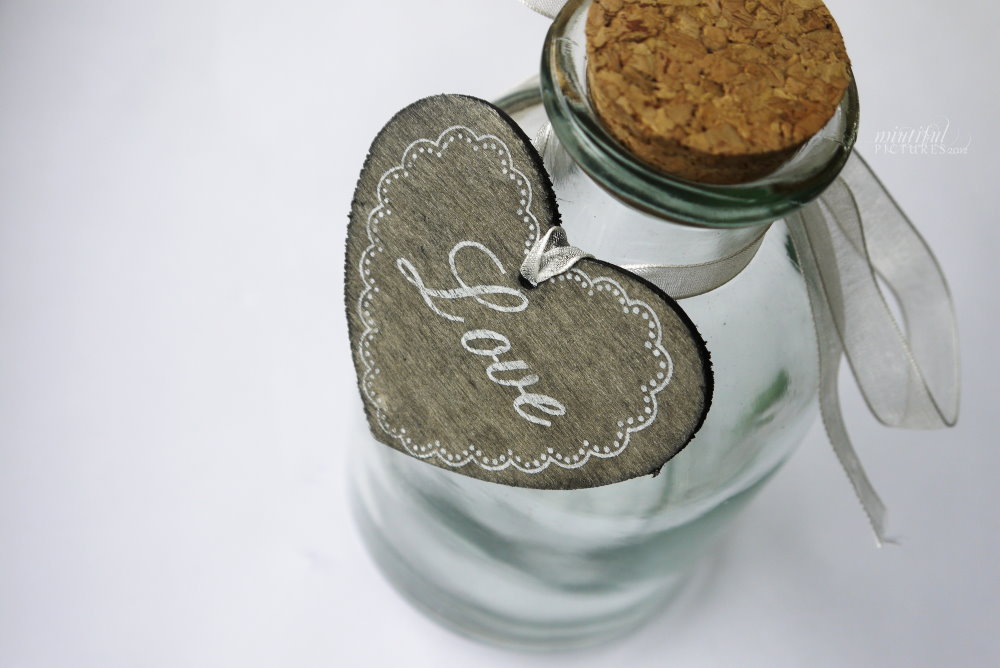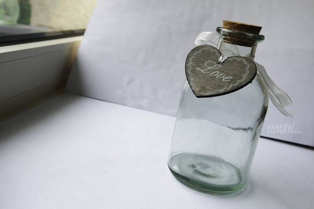 Gekauft habe ich diese Glasflasche bei Nanu-Nana für 2,95€. Eigentlich ist es an sich auch schon ein sehr schönes Dekostück mit dem Korken, dem Holzherzen und der Organzaschleife.