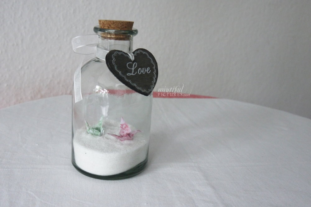 Mit einem Paar Stäbchen habe ich die Kraniche festgehalten und sie dann in die Flasche geführt, man kann die Kraniche auch in die Flasche plumsen lassen und dann mit den Stäbchen (oder Schaschlikspießen) die Kraniche zurechtrücken. Mir war aber wichtig, dass man auf dem Dekosand keine “Spuren” sehen kann und habe daher die Kraniche direkt mithilfe der Stäbchen positioniert.