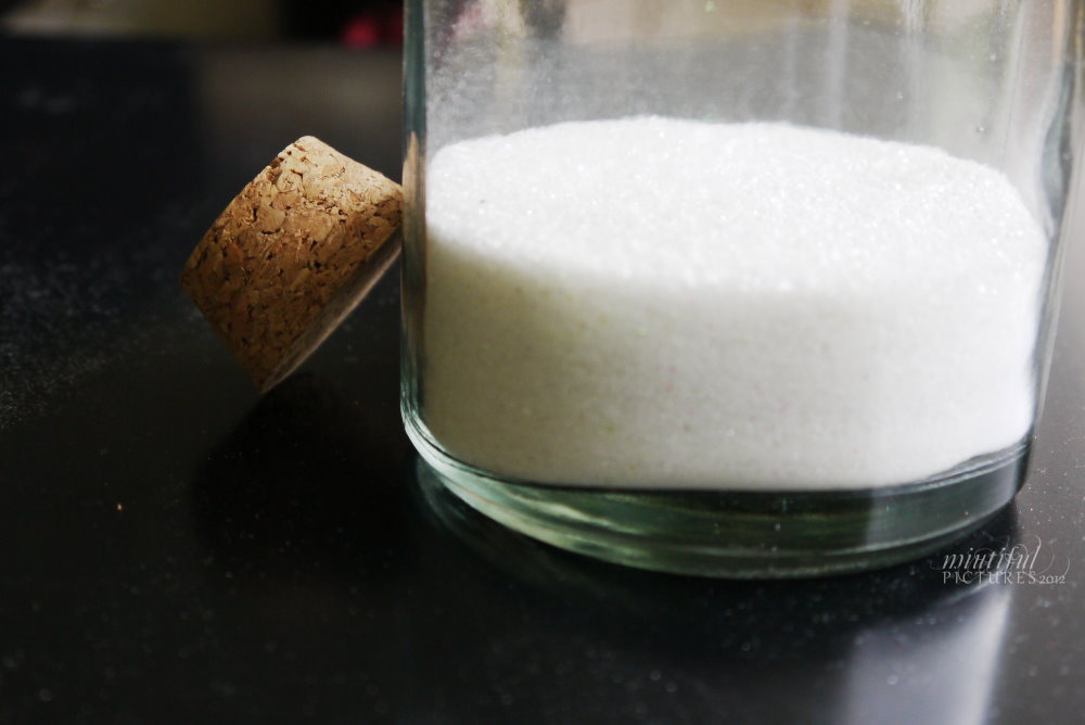 Zunächst habe ich die Flasche mit weißen Dekosand (ebenfalls bei Nanu Nana gekauft) ungefähr 4cm hoch gefüllt.