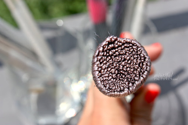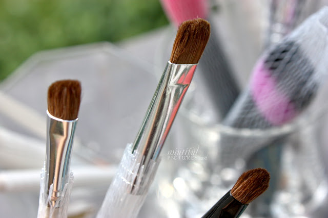 Am nächsten Morgen habe ich die Pinsel erstmal nackig gemacht, sie begutachtet und musste feststellen, dass die eher dickeren Pinsel für Foundation, Rouge und Puder noch recht feucht waren und dass einige Härchen durch die kleinen Schlitze geflüchtet sind und nach außen hin pieksten.