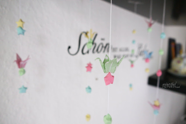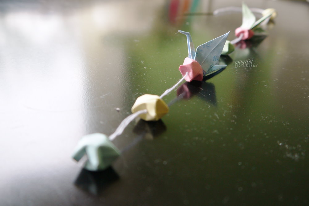 Ich habe mich dann ungefähr zwei Stunden hingesetzt und ganz viele Kraniche und Sternchen aufgefädelt und sie dann an die Unterseite angbracht. Ich persönlich finde es schöner, wenn die Ketten verschiedene Längen haben, wenn die Farben der Kraniche und Sterne aufeinander abgestimmt sind und Variationen bestehen.