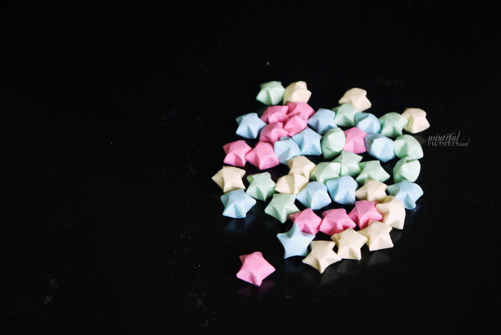 Zunächst habe ich ganz ganz viele Sterne gefaltet (und bestimmt dabei 4 Folgen Detektiv Conan geschaut). Die Stern-Origami-Streifen hat meine Mommy mir aus Vietnam mitgebracht, aber man kann sie z.B. auch hier bei ebay kaufen.