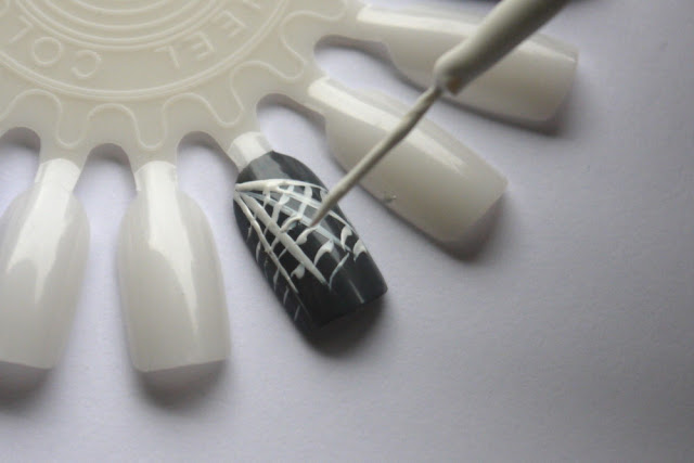 Weißen Nagellack mithilfe eines feinen Pinsels von einer Ecke des Nagels nach vorne hin mehrere Streifen ziehen. Dann quer in den Zwischenräumen die Streifen mit kleinen geschwungenen Strichelnen verbinden, umso unsere Spinnenweben zu kreieren.