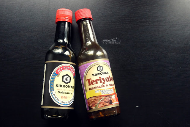 Es kommt drauf an, wie viel Fleisch gekocht werden soll, aber für 400g habe ich jetzt ungefähr 4EL Teriyaki-Soße und 2EL Sojasoße verwendet – das Verhältnis sollte dabei also ungefähr 2:1 betragen.