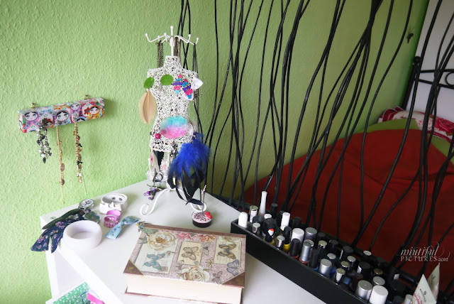 Ich liebe meinen neue Schminkecke ♥ , es gibt halt nur noch einige Kleinigkeiten, die ich verändern möchte: Wie die Haarschmuckpuppe, die auf der linken Seite neben dem Spiegel hängt (habe das Gefühl es wirkt ein wenig überfüllt), die Schubladen für mein Regal (kaufe ich mir wahrscheinlich nächstes Wochenende, wenn ich in Essen bin) und auch die Kuscheltiere finden wohl bald die Tage ihren Weg in den Keller (obwohl ich mich so ungern von ihnen trenne, da sie mich an sehr viele verschiedene wichtige Momente erinnern *www*♥).