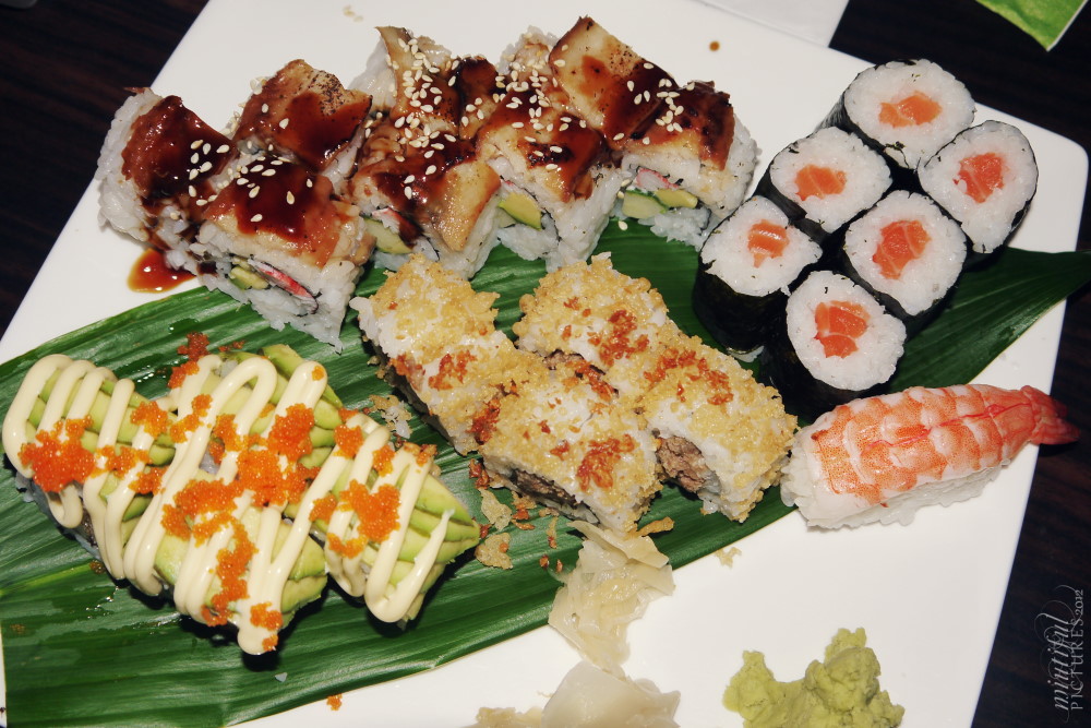 Die Tokyo Lounge führt ein ähnliches System wie im Okinii mit einigen Abänderungen: Man bezahlt zu einem festen Preis von 27,50€ (schon eine große Summe find ich) und kann so viel essen wie man schafft. Pro Runde kann jede Person am Tisch drei Gerichte wählen, zur Auswahl standen Nigiris (sogar mit Aal und Tobiko), schlichte Makis, Handrolls (looove, lovee), ausgefallene Rollen (California, Aal on Top-Rollen, etc.), sogar Sashimi (frisch und auf Eis angerichtet!) und andere viele Leckereien, wie Garnelen, Suppen, Spieße und verschiedene Fleischsorten – nur vom Aufzählen knurrt mir schon wieder der Magen *nomnomnom*.