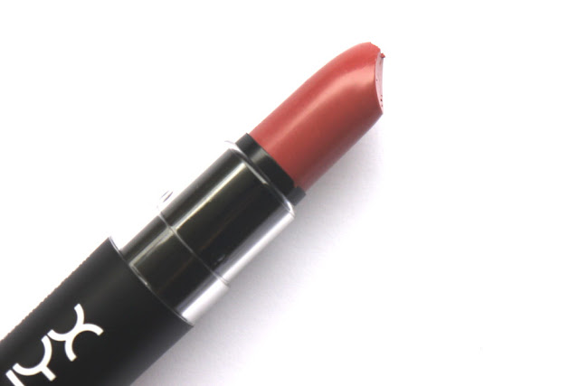In meiner Sammlung von Lippenstiften (die viel zu selten zum Einsatz kommen) befinden sich bereits drei NYX-Lippenstifte, nämlich 628 Tea Rose, 513 Electra und 608 Perfect. Der Neuankömmling in der Familie ist somit mein erster Matte Lipstick von NYX.