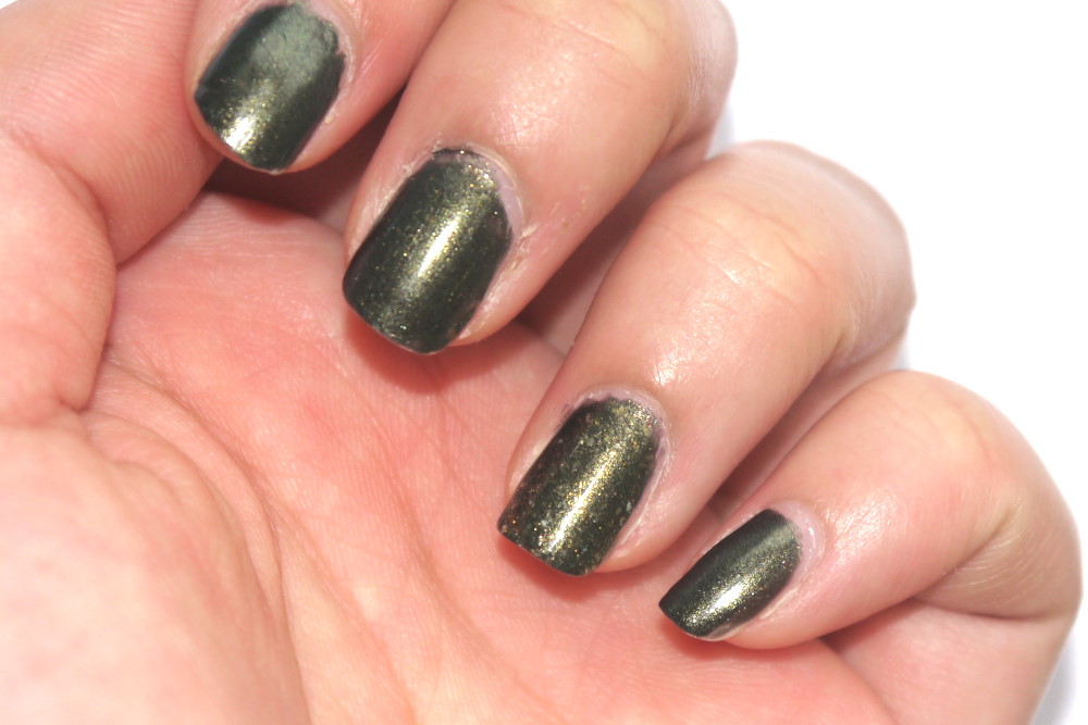 Osiris-Goldgrau ist für mich ein sehr dunkles, tiefes Grün-Grau mit gold-grün-blauem Schimmer. Ich finde die Farbe ganz allein ziemlich trist und langweilig, da man den farbenfrohen Schimmer auf den Nägeln nicht erkennen kann, sondern nur noch ein dunkelgrüner Schimmer zurückbleibt.