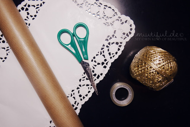 Das Geschenk zunächst mit dem Packpapier einpacken und dann sich ein großzügiges Stück Tortenspitze zurechtschneiden.