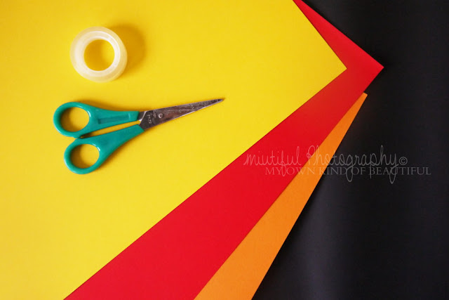 Die gelben und roten Papp-Rechtecke werden abwechselnd an die obere Kante der Tür des Kühlfachs geklebt. Ist die obere Kante gut bedeckt, bildet man mit den übriggebliebenen Teilen den Rest des Schals inklusive Fransenstück.