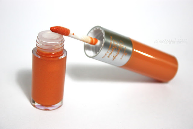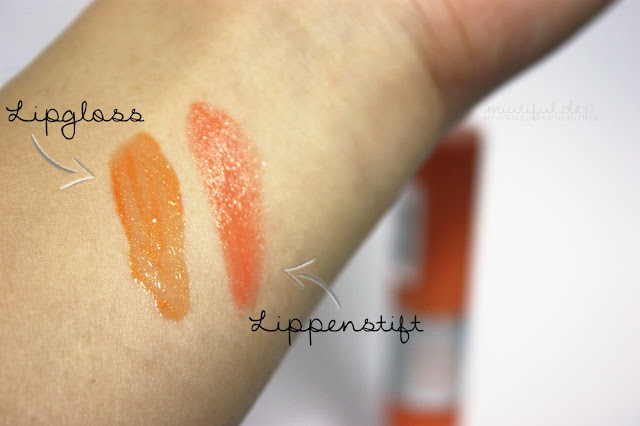 Bei dem Gloss handelt es sich um ein gelbliches Orange mit vielen goldenen Glitzerpartikeln, während es sich bei dem Lippenstift um ein “echtes” Orange mit sehr feinen und wenigen, goldenen Schimmerpartikeln handelt.