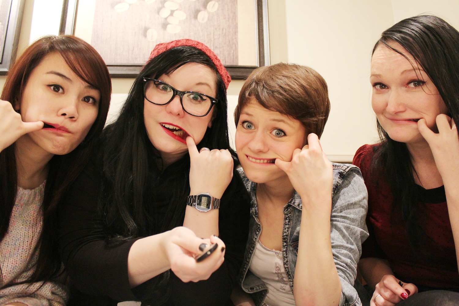 Sissy hatte genialerweise auch noch den Fernauslöser zu ihrer Kamera dabei (… ich mag auch so gern eine Kamera mit schwenkbarem Display haben *www*//) und wir zogen in fröhlicher Blogger-Manier Grimassen und Schnuten – dabei saßen wir im Erdgeschoss direkt neben dem Eingang *höhö*