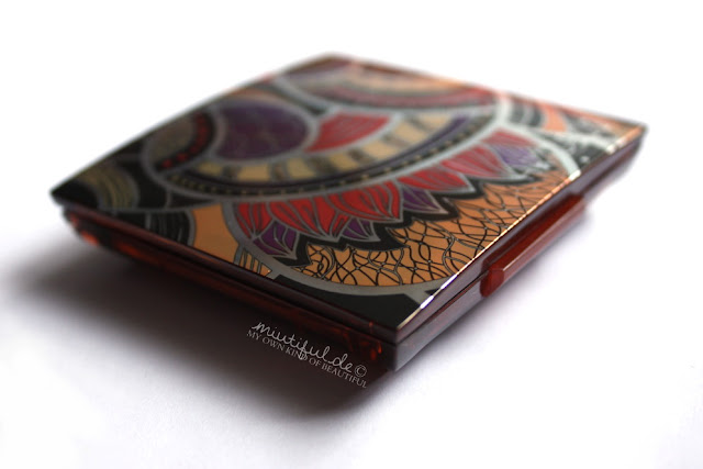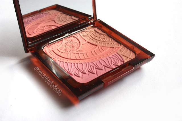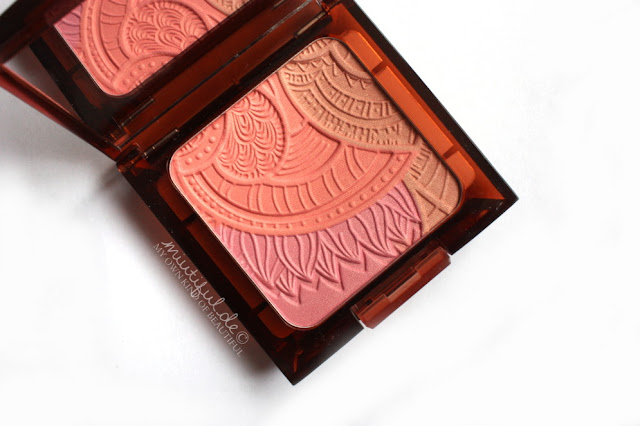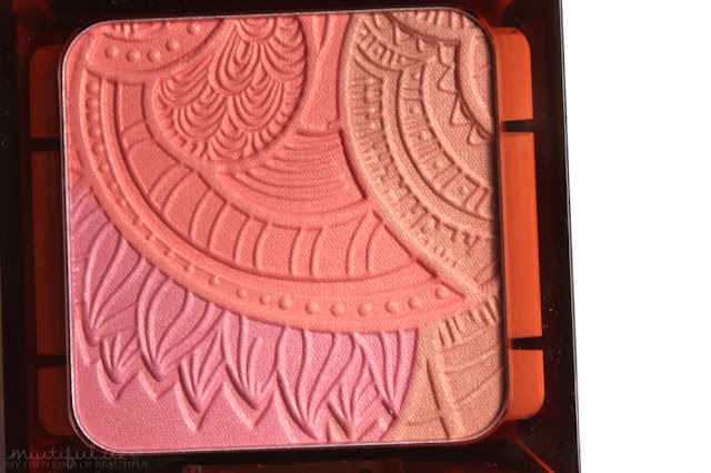 Der Blush besteht aus den Farben Pink, Koralle und einem hellen Braunton, die in hübsch-geschwungenen Ornamenten zusammengesetzt worden sind. Bei allen drei Farben handelt es sich um “feste Bestandteile” des Blushes und nicht nur um Oversprays.