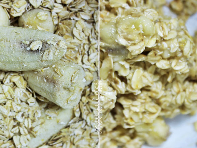 Am besten sollten die Bananen schon wirklich gut reif sein damit sie die Süße des Zuckers ersetzen. Die Bananen schälen und dann mit den Haferflocken vermengen bis die beiden Zutaten eine gleichmäßige Masse bildet.