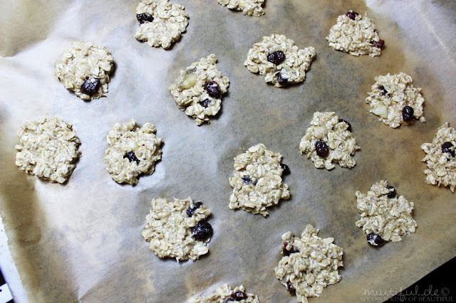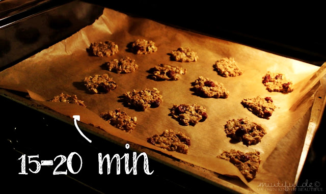 Pro Keks habe ich ungefähr 1EL “Teig” genommen und aufs Backblech flach gedrückt. Nebenbei kann der Backofen bereits auf 175°C vorgeheizt werden. Das Ganze wird dann für 15-20 Minuten im Ofen gebacken.