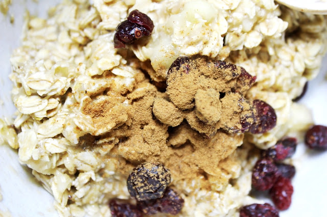 Eigentlich kann man die Kekse bei diesen beiden Zutaten belassen, aber für etwas mehr Geschmack habe ich eine Hand voll Cranberrys reingeworfen und eine gute Portion Zimt hinzugefügt.