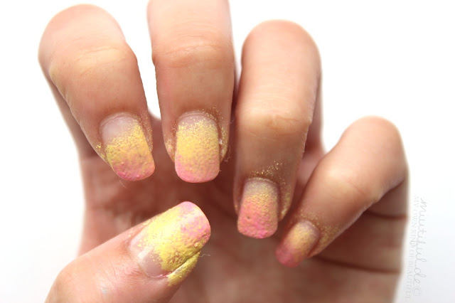 Sobald man mit dem Top Coat über die beiden Farben geht wird der Farbverlauf deutlich weicher. Ich habe nicht meine kompletten Nägel eingetupft, weil ich diesen bröseligen Übergang sehr hübsch finde (und ich keine Lust hatte so viel zu schmieren *höhö*).